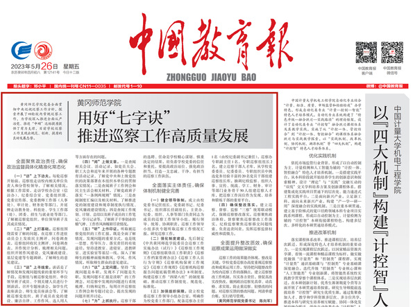 5月26日,《中国教育报》08版刊发了我校党委书记陈向军的文章《用好“七字诀” 推进巡察工作高质量发展》。文章从“全面聚焦政治责任,确保政治监督具体化精准化常态化”“全面落实主体责任,确保体制机制健全完善”“全面提升整改质效,确保巡察成果运用做深做实”三个方面介绍了我校巡察工作主要做法。