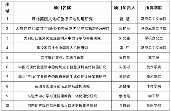 本网讯 近日,湖北省教育厅公布了2022年湖北省高等学校哲学社会科学基金前期资助项目立项名单,我校获批项目10项,其中入选湖北省高等学校马克思主义中青年理论家培育计划 (第九批) 2项,获批湖北省高等学校哲学社会科学研究重大项目8项。项目获批数量居全省高校第4位。