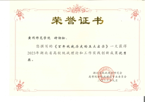 近日,湖北省高校统战理论研究会第38次年会在孝感召开,对2022年全省高校统战理论和工作实践创新成果进行表彰。我校刘杰牵头撰写的《新时代加强高校教学学院党组织统一战线工作实务探索》荣获优秀论文一等奖,刘宏明的《加强新时代高校统一战线工作制度体系的构建》、杜杰的《新时代提升高校基层统战工作的科学化规范化制度化的思考》荣获优秀论文三等奖,钟劲松的《百年统战历史的五点启示》获优秀奖。我校在年会上作典型交流发言。
