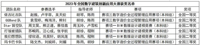 本网讯 12月21日,中国建设教育协会公布了2023年全国数字建筑创新应用大赛获奖名单。由我校建筑工程学院教师胡琴、陈雨、胡珍、程刚等指导,袁雪婷、陆文杰、赵振、周文昊等学生组成的6支队伍不畏强手,奋勇拼搏,在全国数字建筑创新应用大赛总决赛中全部获奖,其中一等奖1项,二等奖4项,三等奖1项。