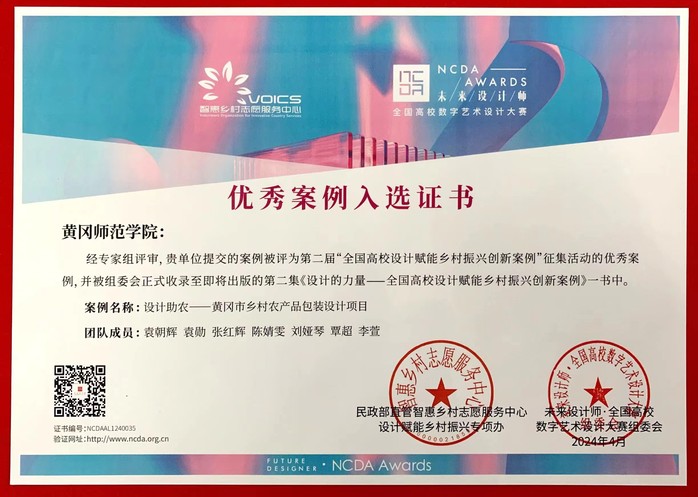 据悉,“全国高校设计赋能乡村振兴创新案例”征集活动由民政部直管智惠乡村志愿服务中心和未来设计师大赛(教育部A类学科赛事)组委会联合举办,鼓励高校设计学科赋能乡村振兴,发挥学科竞赛“立德树人”功能,得到“学习强国”学习平台,人民网,新华网,半月谈等媒体的报道和展播。第二届“全国高校设计赋能乡村振兴创新案例”湖北省高校案例仅入选22个。