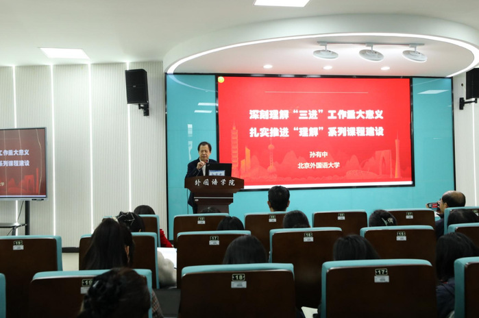 孙有中深刻阐述了“三进”与课程思政、“三进”与新文科建设的关系,系统分析了“三进”的开展对深化课程思政与推进新文科建设的重大意义,以生动活泼的案例从提高认识、把握原则、迈上新台阶等三个方面讲述了如何深化“三进”工作,推进外语学科新文科建设。孙有中强调,外语类专业肩负着提升国家国际传播能力的使命,要“理解中国、沟通世界”,理解当代中国绝不是外语类专业的全部内涵,但外语类专业绝不能没有理解当代中国。