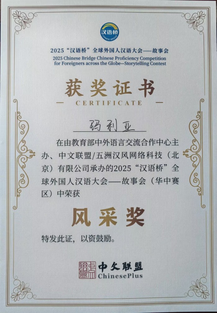 本网讯 3月30日,2025年“汉语桥”全球外国人汉语大会故事会华中区预赛在武汉举行,我校留学生玛利亚获“风采奖”。