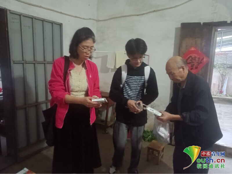 图为实践队员与指导老师为失能老年人家属解读药品服用相关注意事项。